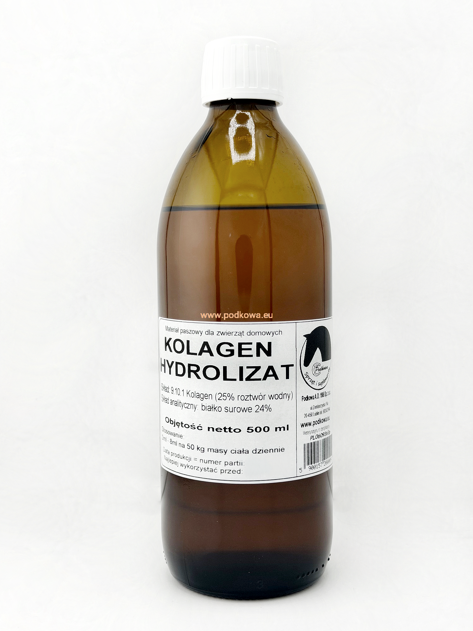 Hydrolizat kolagenu w płynie - formuła zawierająca kolagen poddany procesowi hydrolizy. Kolagen tworzą długie łańcuchy aminokwasów głównie prolina, glicyna, hydroksyprolina i hydroksylizyna połączone wiązaniami peptydowymi, które w procesie hydrolizy są "rozbite" na pojedyncze aminokwasy dobrze przyswajalne z przewodu pokarmowego. Kolagen jest głównym składnikiem tkanki łącznej i najbardziej rozpowszechnionym białkiem w organizmie. Należy do białek włóknistych, stanowi ponad 25% zawartości białka całego ciała. Jest podstawowym elementem tkanki chrzęstnej włóknistej. Tworzy ścięgna, skórę, więzadła, chrząstki, kości, naczynia krwionośne i tarcze międzykręgowe. Hydrolizat kolagenu — „wstępnie przetrawiona” jego postać — charakteryzuje się dobrym przyswajaniem przez organizm zawartych weń aminokwasów. Hydrolizaty kolagenu poleca się przede wszystkim koniom aktywnym fizycznie zwierzętom z urazami aparatu ruchu a także rekonwalescentom w okresie po przebytych urazach oraz zwierzętom starszym. Kolagen dobrze współdziała z glukozaminą, chondroityną, kwasem hialuronowym i witaminą C.