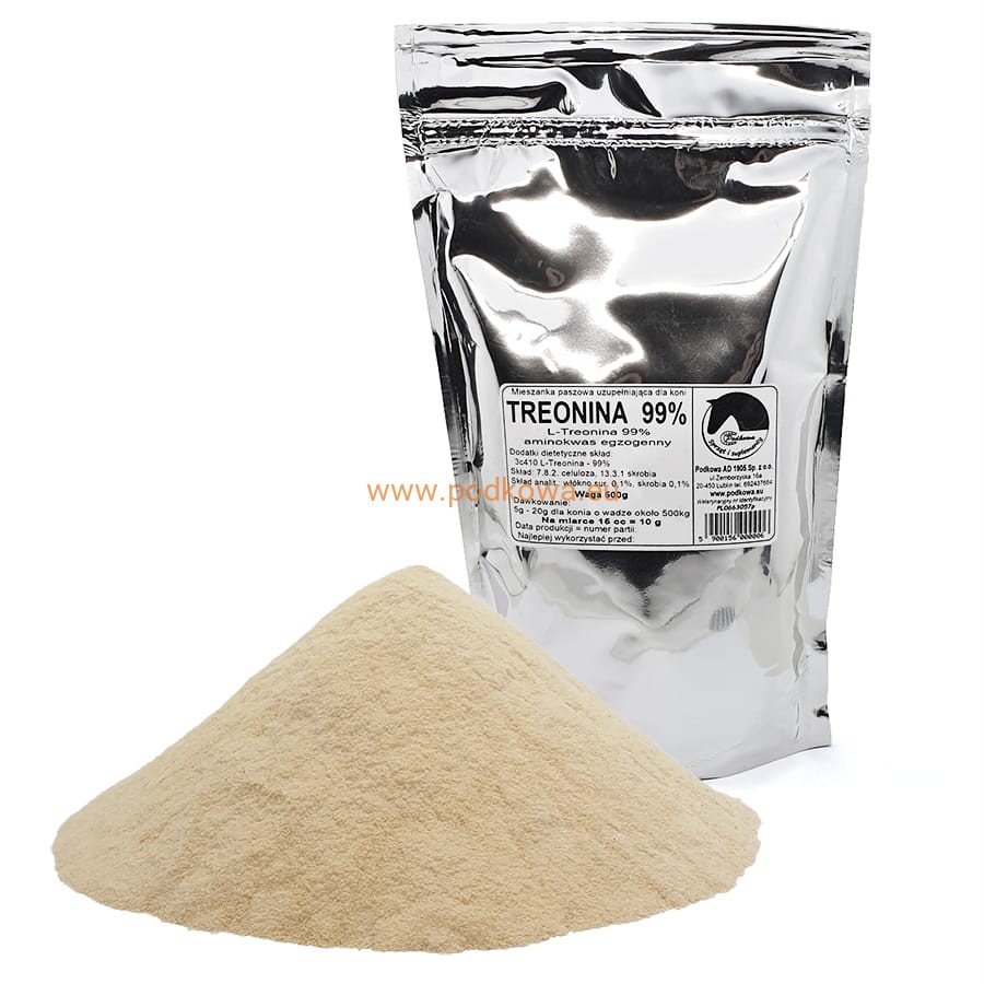 L-Treonina — aminokwas egzogenny, czyli taki którego organizm konia nie potrafi samodzielnie syntetyzować i musi być dostarczany z zewnątrz wraz z pokarmem. Treonina jest niezbędna dla prawidłowego funkcjonowania układu nerwowego. Treonina jest niezbędna w procesie syntezy nowych białek mięśniowych. Ma ona ważny wpływ na produkcję wielu białek, kolagenu, elastyny, dzięki czemu dobrze wpływa na stan stawów, ścięgien, kopyt, mięśni i skóry. Bierze udział w metabolizmie tłuszczów przyspieszając ich spalanie. Najlepsze efekty daje podawanie razem 5 aminokwasów w proporcji do lizyny: lizyna — 10, metionina — 6, treonina — 7, tryptofan — 2, walina - 5.