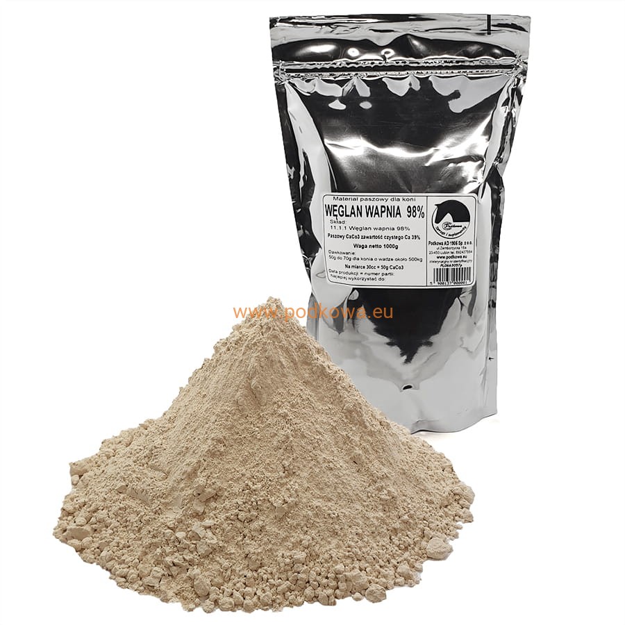 Zawartość CaCo3 minimum 98% zawartość czystego Ca 39%. Bez badań siana dawka dzienna to 50 – 70 g preparatu na konia o średniej wadze 500kg.